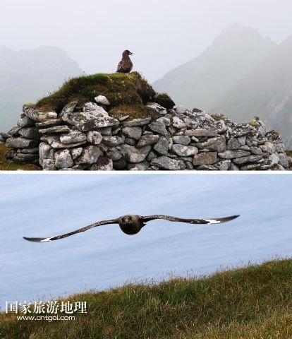 上圖,一只大賊鷗把當(dāng)年村民的儲物石屋當(dāng)作了自己的巢穴(7月19日攝)。圣基爾達島上散布著數(shù)百個石頭壘砌,草皮作頂?shù)膬ξ锸?,用來保存村民獵取的鳥類和用途燃料的泥炭。下圖,一只大賊鷗直飛過來,襲擊靠近它的巢穴的記者(7月19日攝)。
