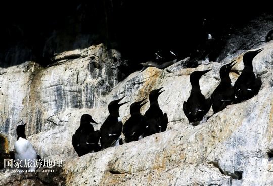 幾只海鴉棲息在圣基爾達島的巖壁上(7月20日攝)。