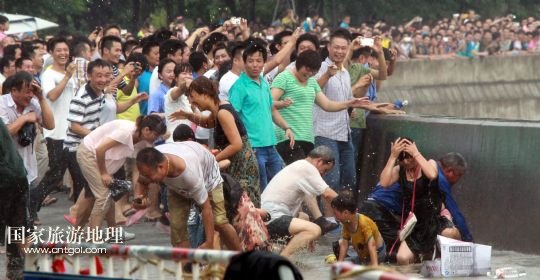 9月21日,在杭州下沙錢塘江沿岸,不少躲避不及的觀潮者被來勢(shì)洶洶的潮水淋得全身濕透。