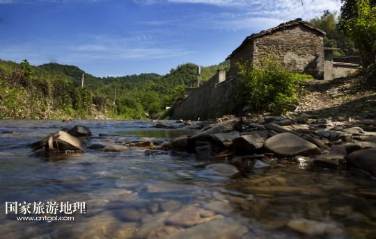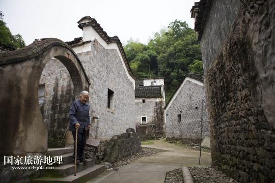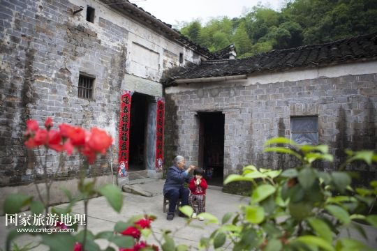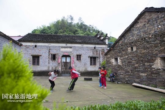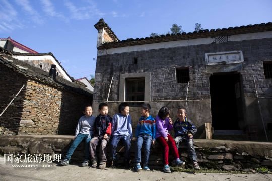 國家旅游地理 江西九江5月12日訊 5月12日,孩子們坐在土目源村的老房子前玩耍??沼牡纳焦?,不息的溪流,斑駁的石墻,古樸的石屋。在江西省北部山區(qū),有一座石屋山居的古村落——都昌縣大港鎮(zhèn)土目源村。