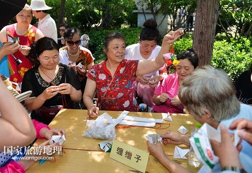 5月28日,手工老師顧小玲(中)在后海小廣場向?qū)W習(xí)者展示她纏的繒子。