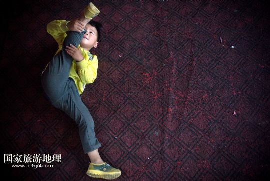 剛來到這里的孩子都要從最基本的壓腿、翻跟頭等基礎訓練學起,練好基本功后大部分孩子會離開學校,過幾年長大一些再回來學些雜技表演動作,學得好就可以上臺參與表演。