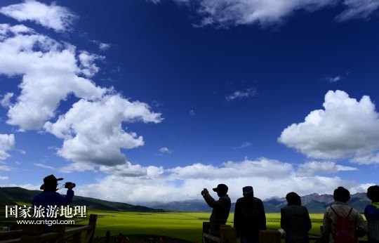 7月22日,游客在門源油菜花田的觀花臺上拍照。