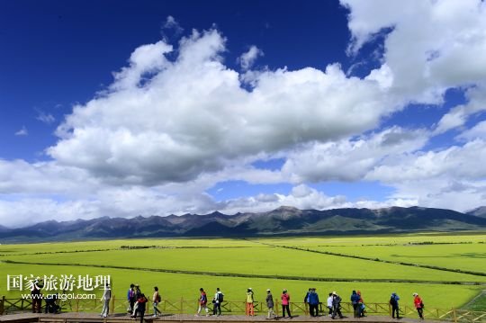 7月22日,游客在門源油菜花田的觀花臺上觀賞。