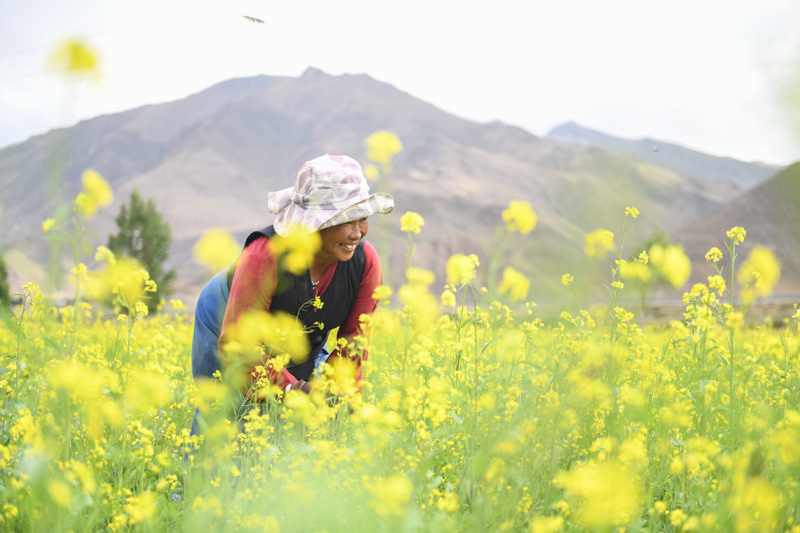 7月2日,拉薩市堆龍德慶區(qū)朗巴鄉(xiāng)村民玉珍在打理油菜花田。